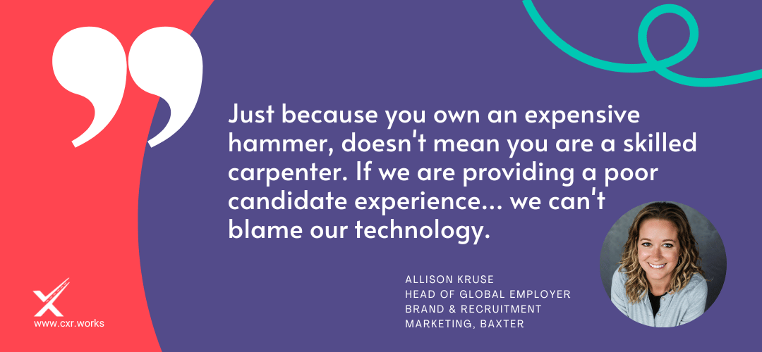 Just because you own an expensive hammer, it doesn't mean you are a skilled carpenter. On the flip side, if you do a shoddy job, and that chair you just cobbled together falls apart, you can't blame the hammer. If we are providing a poor candidate experience, devoid of a personal touch, we can't blame our technology. - @Allison Kruse, Head of Global Employer Brand & Recruitment Marketing, Baxter International Inc.