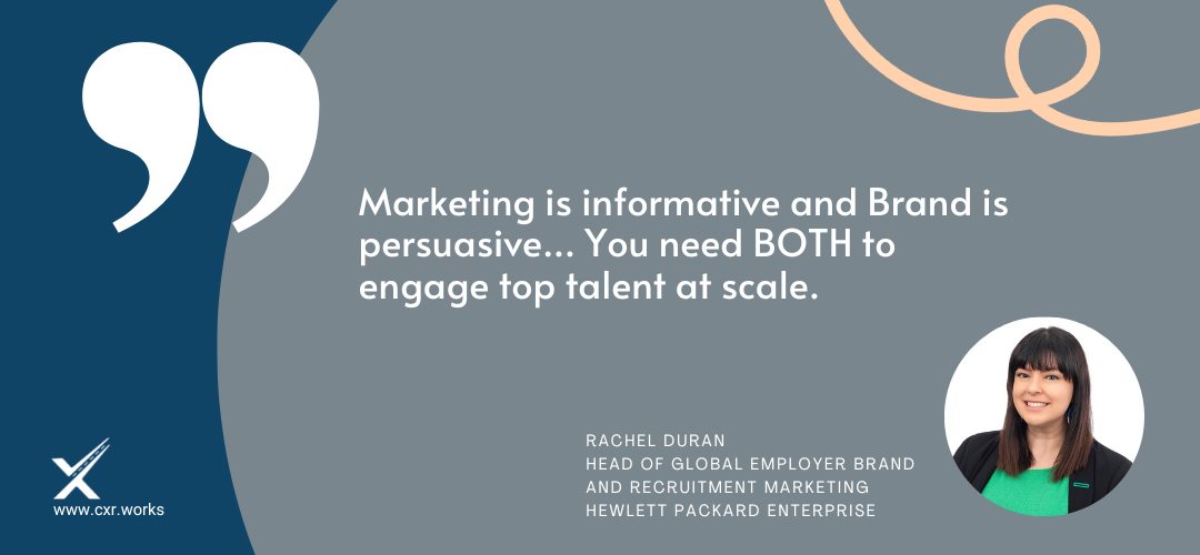 "I always say the Marketing is informative and the Brand is persuasive. Maybe everyone wants to work for your org but never sees a job opening. Maybe everyone sees your job openings but aren't motivated to apply. You need both to engage top talent at scale." - @Rachel Duran, Head of Global Employer Brand & Recruitment Marketing, Hewlett Packard Enterprise.
