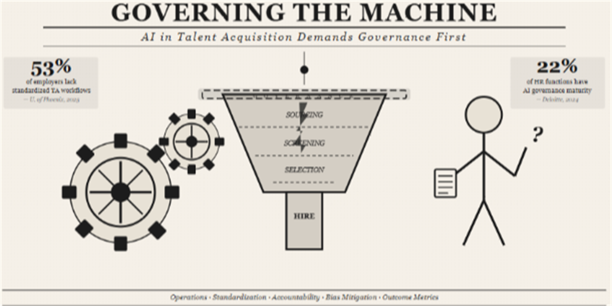 What makes this particularly difficult in HR and TA is that the function is simultaneously the most people-consequential and, in many organizations, still the most operationally under-resourced. Every stakeholder in the hiring journey — the recruiter navigating an AI-assisted pipeline, the hiring manager interpreting AI-generated rankings, the candidate whose livelihood may hinge on how an algorithm scores their resume, the HR leader accountable for outcomes no one yet knows how to measure — every one of them is exposed when governance is absent.