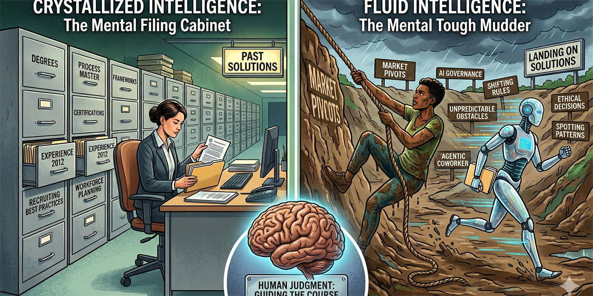 Crystallized intelligence built the foundation. Fluid intelligence is the mental Tough Mudder keeping us agile, muddy, and unreasonably resilient. And agentic AI changes the terrain entirely.